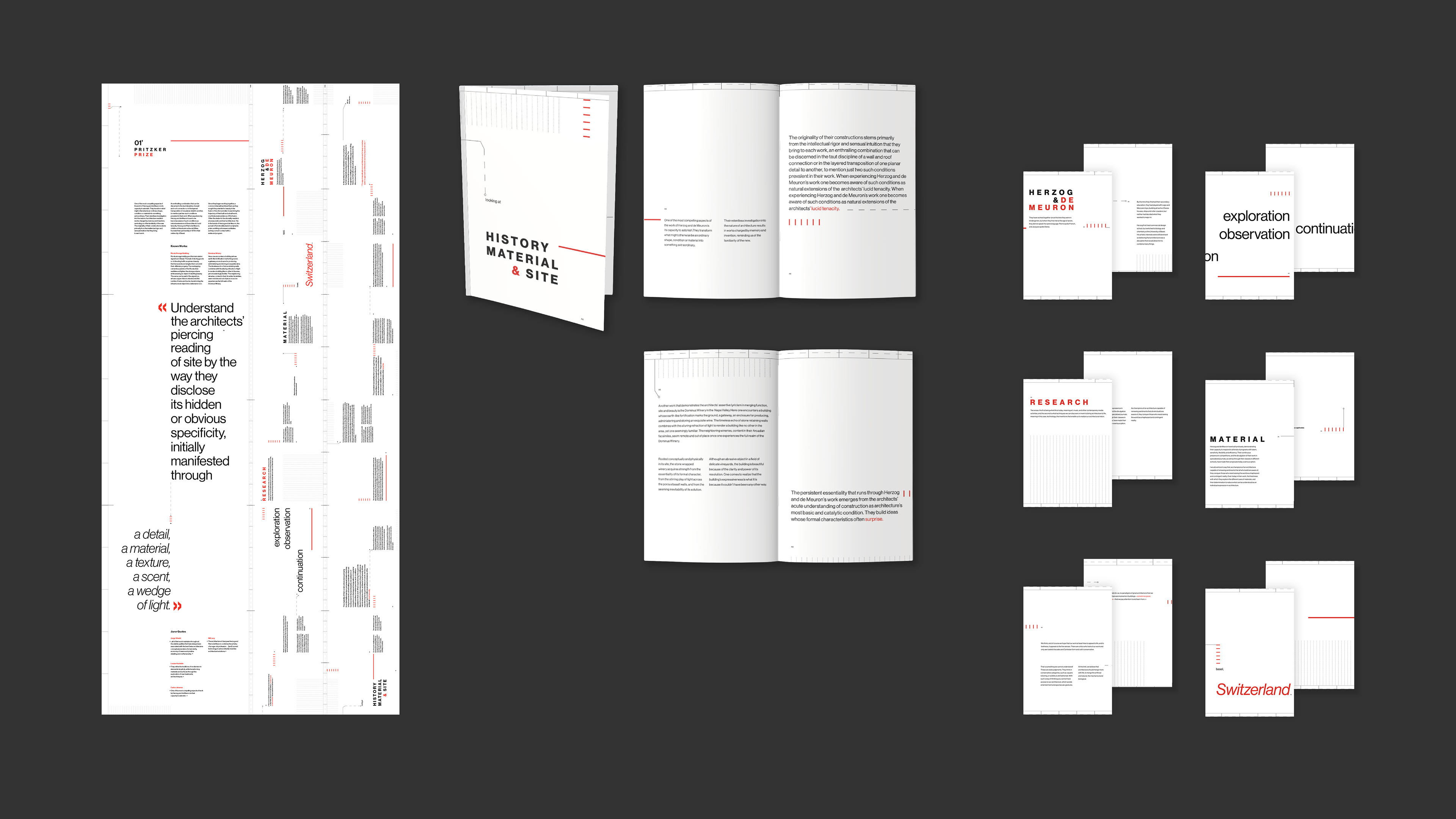 The colors and type was specifically chosen so the reader is able to observe the context of the design. Colors emulated traditional Swiss design, and the marks displayed small details that leads the reader to certain areas. Readers are tasked to observe the type, color and paper, to reflect how Herzog and de Meuron approach their designs– by examining the details and surroundings.