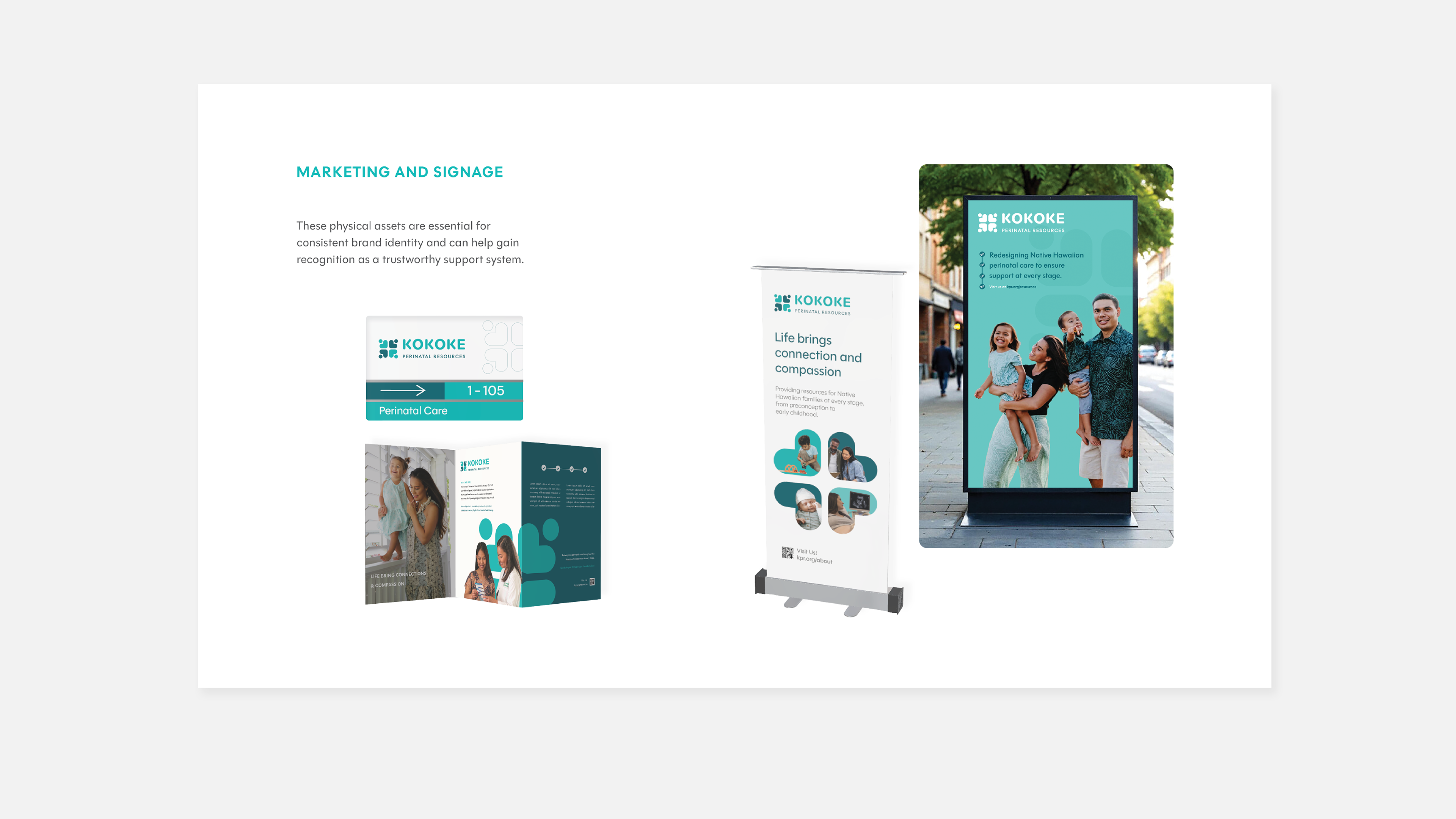Mock ups of posters, brochures, and signs were created to show the client how a logo can spread awareness for Kokoke across all islands. These are important assets for building a cohesive brand identity, and gain recognition as a trustworthy support system.