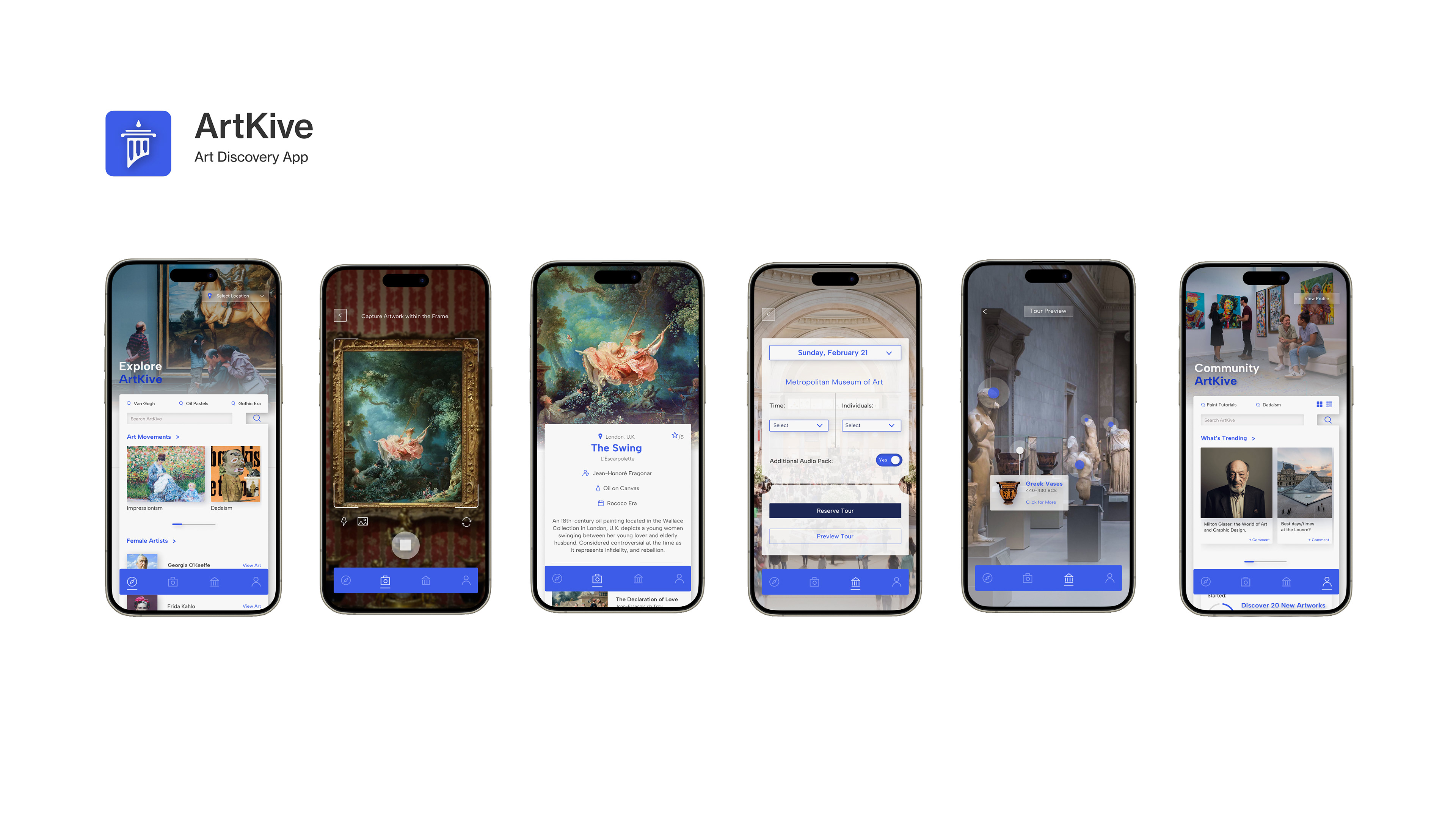 This app was created to inform an audience about artworks that captured their interest but aren’t able to identify the name or artist. Other apps were referenced to design innovative layouts such as an artist's progressive timeline, artwork rating system, and ability to book a tour. The color blue was specifically chosen to encourage imagination and provide freedom to express oneself.